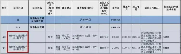 柳州交通軌道2號線一期工程,將于2020年12月開工,竣工時間2024年12月,建設地點為城中區、柳江區,線路長度23.4公里,設車站19座。近期建設規劃已上報國家發展改革委,待審批。項目已完成可行性研究報告。