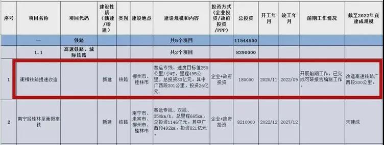 其中,柳州經梧州至廣州鐵路柳州至梧州段將于2020年12月開工,2024年12月竣工,建設地點為柳州市、來賓市、梧州市。