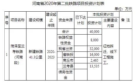 8月19日,據(jù)河南省發(fā)改委網(wǎng)站消息,該委近日發(fā)通知,河南省2020年第二批鐵路項目投資計劃下達。本次投資計劃安排1個項目,為菏澤至蘭考鐵路(河南段)項目,下達年度投資計劃4億元。
