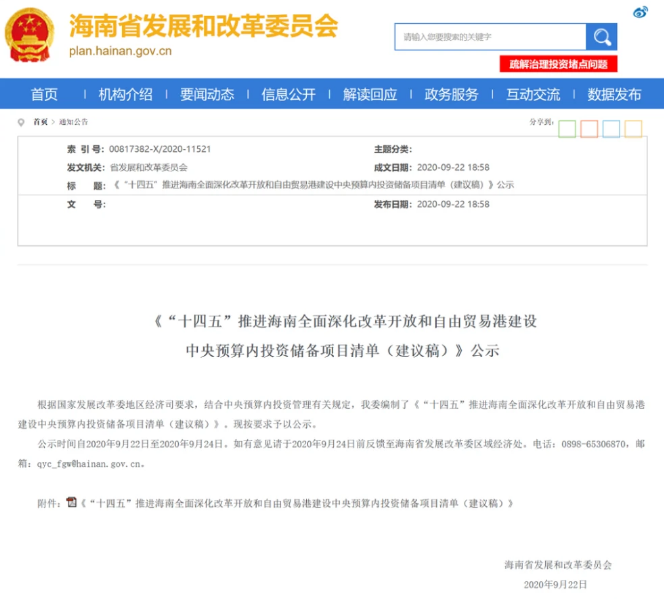 9月22日,海南發改委公布了《“十四五”推進海南全面深化改革開放和自由貿易港建設中央預算內投資儲備項目清單(建議稿)》。