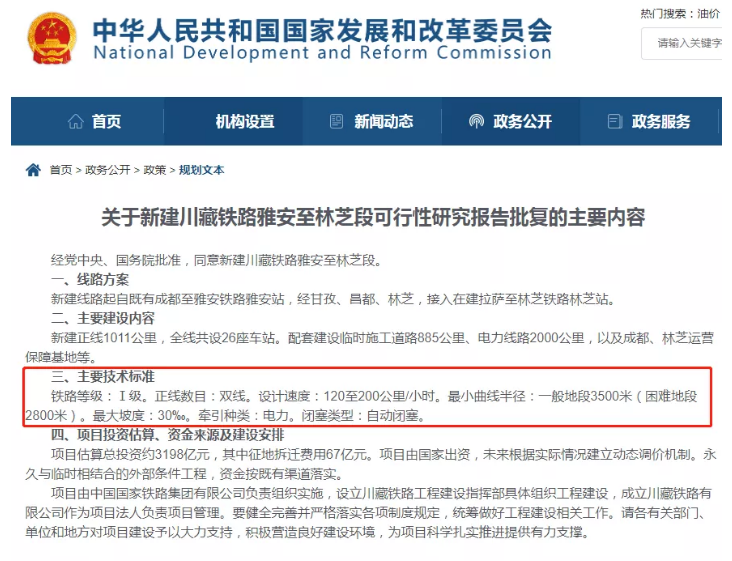 9月30日獲悉,發改委官網消息:經黨中央、國務院批準同意新建川藏鐵路雅安至林芝段。項目估算總投資約3198億元。