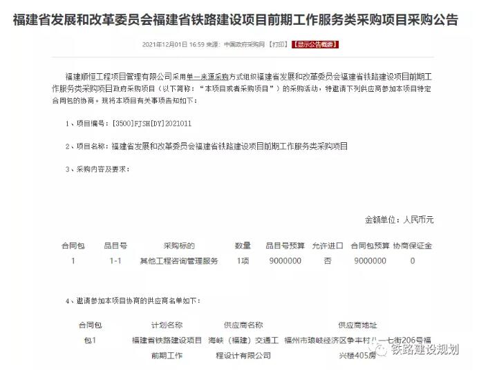 12月1日,《福建省發展和改革委員會福建省鐵路建設項目前期工作服務類采購項目采購公告》發布,6個鐵路項目和福建省港鐵聯運一體化發展規劃進入研究階段。