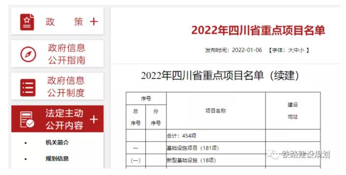 1月6日,《2022年四川省重點項目名單》發布,其中涉及鐵路項目20項,包括續建項目12項,新開工項目8項,詳單如下: